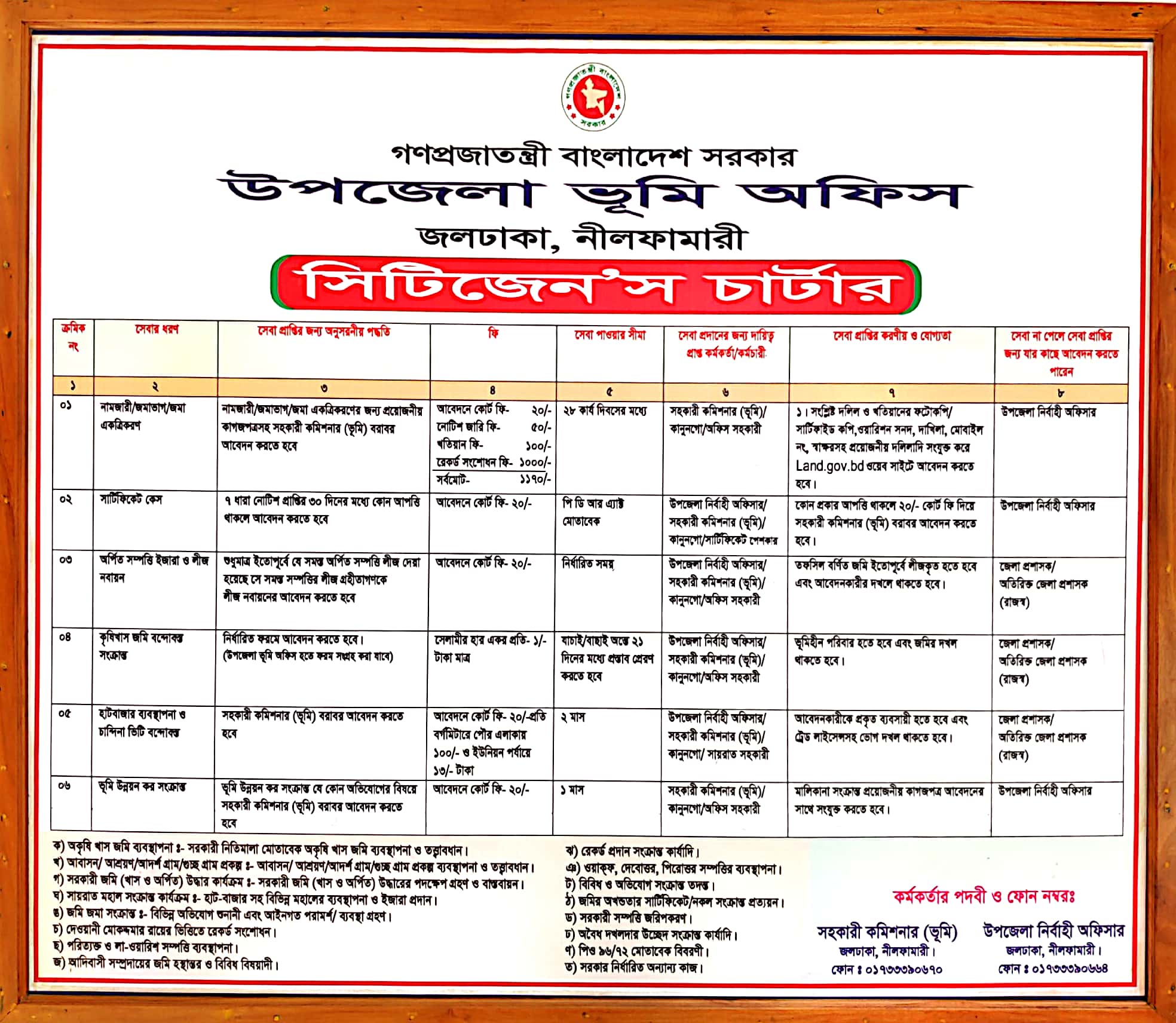 | ০১ | উপজেলা ভূমি অফিস | নামজারী ও জমাভাগ | ১। সহঃ কমিশনার (ভূমি) | আবেদন প্রাপ্তির পর নামজারীর প্রস্তাব/ প্রতিবেদনের জন্য ইউনিয়ন ভূমি অফিসে প্রেরণ এবং প্রতিবেদন প্রাপ্তির পর পক্ষগণকে নোটিশ প্রদানক্রমে শুনানী গ্রহণ ও স্বত্ব দখল বিবেচনায় কোন আপত্তি না থাকলে অনুমোদন। | সর্বোচ্চ ৪৫ দিন | আবেদন ফি(কোর্ট ফি)- ৫ টাকা নোটিশ জারী ফি-২.০০ টাকা (অনধিক ৪ জনের জন্য) ৪ এর অধিক প্রতি জনের জন্য আরো ০.৫০ টাকা হিসেবে আদায় করতে হবে। রেকর্ড সংশোধন ফি-২০০ টাকা খতিয়ান ফি-৪৩ টাকা সর্বমোট=২৫০/- | SA &T Act , 1950 প্রজাস্বত্ব বিধিমালা ভূঃ ব্যঃ ম্যানুঃ। পরিপত্র | অতিরিক্ত জেলা প্রশাসক (রাজস্ব) বরাবর নামজারী আপীল দায়েরকরণ |